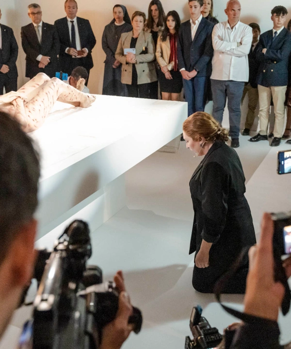 El recorrido culmina con la visión de la reconstrucción hiperrealista del Hombre de la Sábana Santa, un trabajo sin precedentes que condensa más de quince años de investigaciones forenses, artísticas e históricas. La escultura, a tamaño natural, reproduce con exactitud cada herida y rasgo anatómico: las marcas de la flagelación, los orificios de los clavos, la herida en el costado, las señales de caídas y las huellas de tierra. El cuerpo aparece en la postura fijada por la rigidez cadavérica, con las rodillas flexionadas y la cabeza inclinada, reflejando el instante final tras la crucifixión. El rostro, hinchado y marcado por los golpes, transmite un profundo sufrimiento, pero también una serena dignidad, como si capturara el momento entre la muerte y la resurrección. Esta representación no es solo un ejercicio técnico o científico, sino una obra con un fuerte componente emocional y espiritual. Al contemplarla, el visitante se enfrenta a una imagen que trasciende el tiempo y el espacio, un testimonio tangible del sacrificio y un recordatorio visual de la entrega total que narra el Evangelio. El silencio de esta sala, roto solo por la impresión que provoca la obra, convierte el final de la visita en un momento de contemplación y recogimiento.